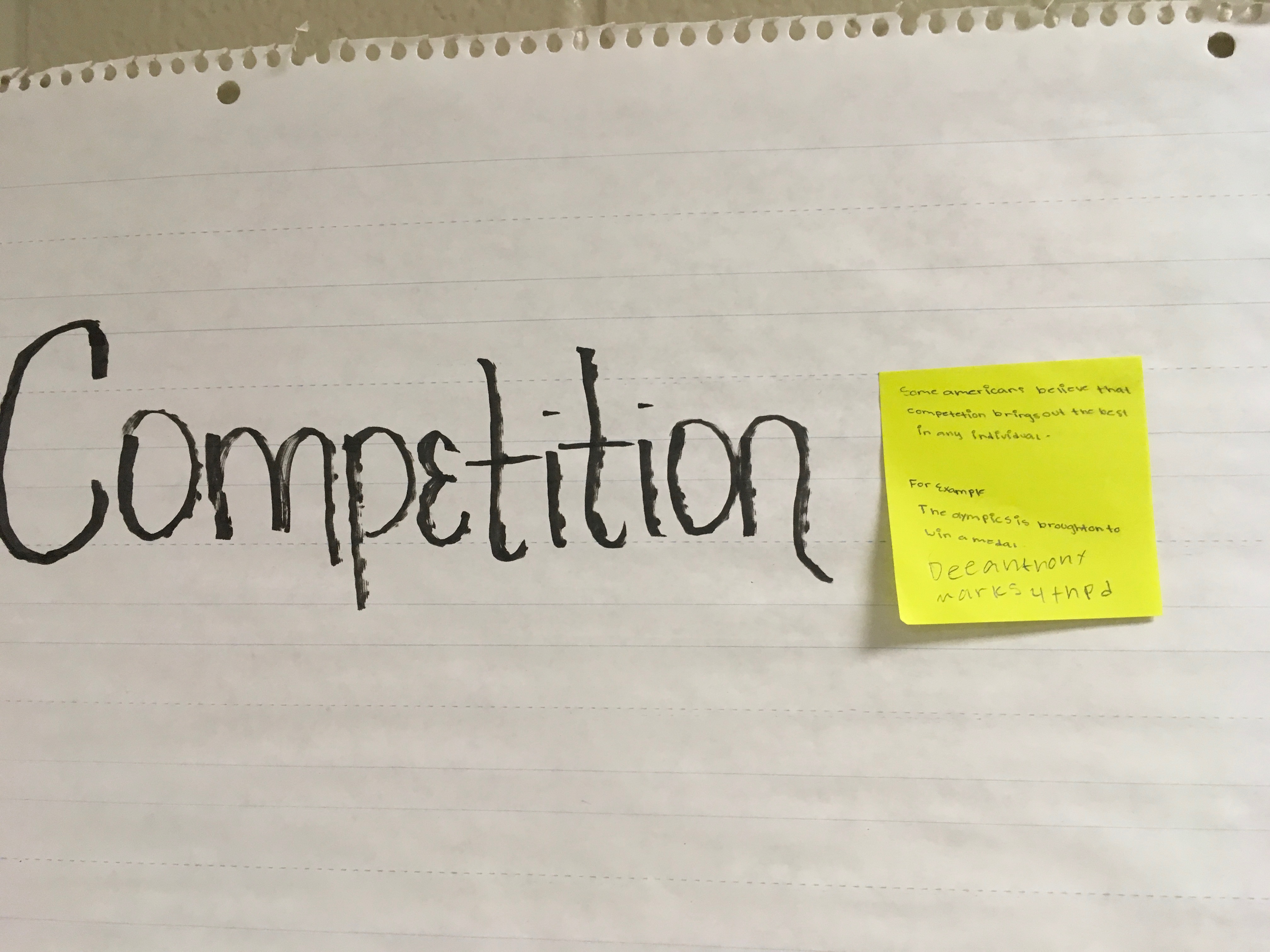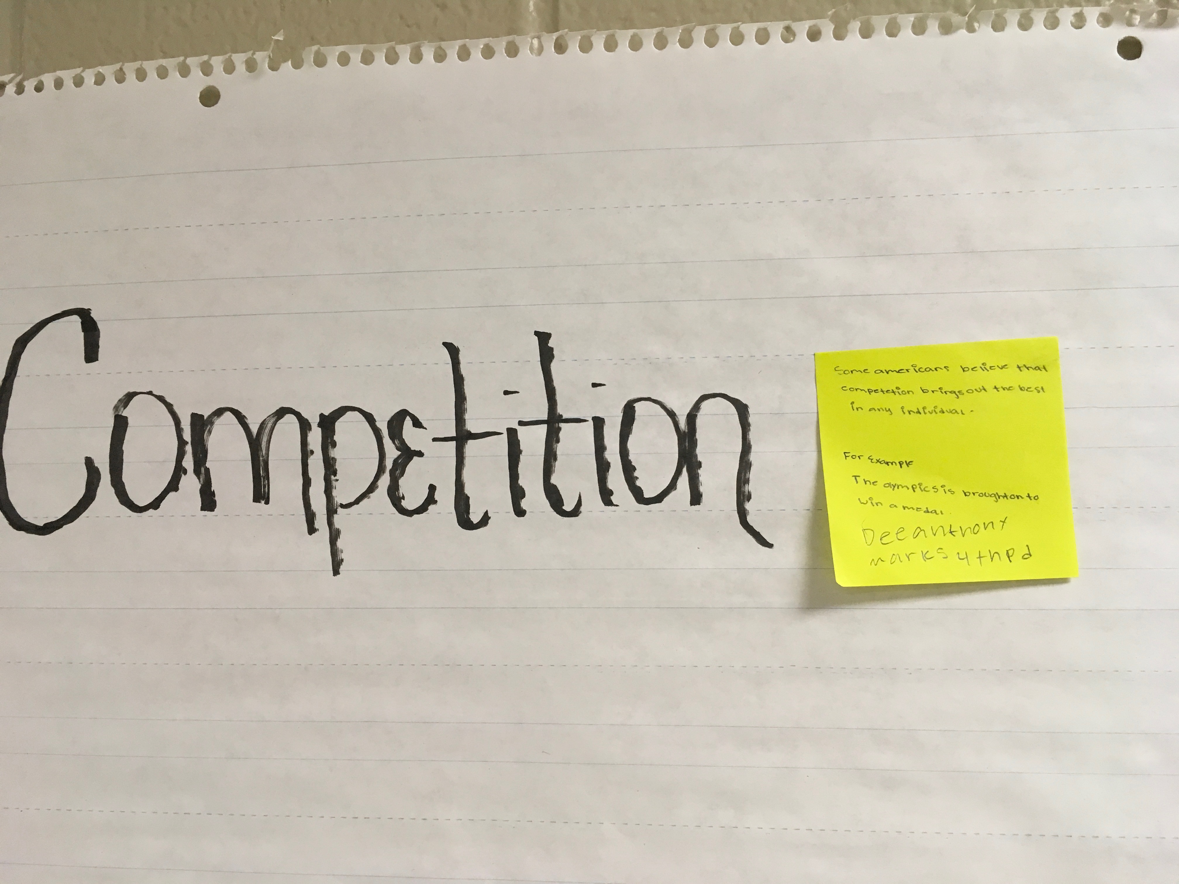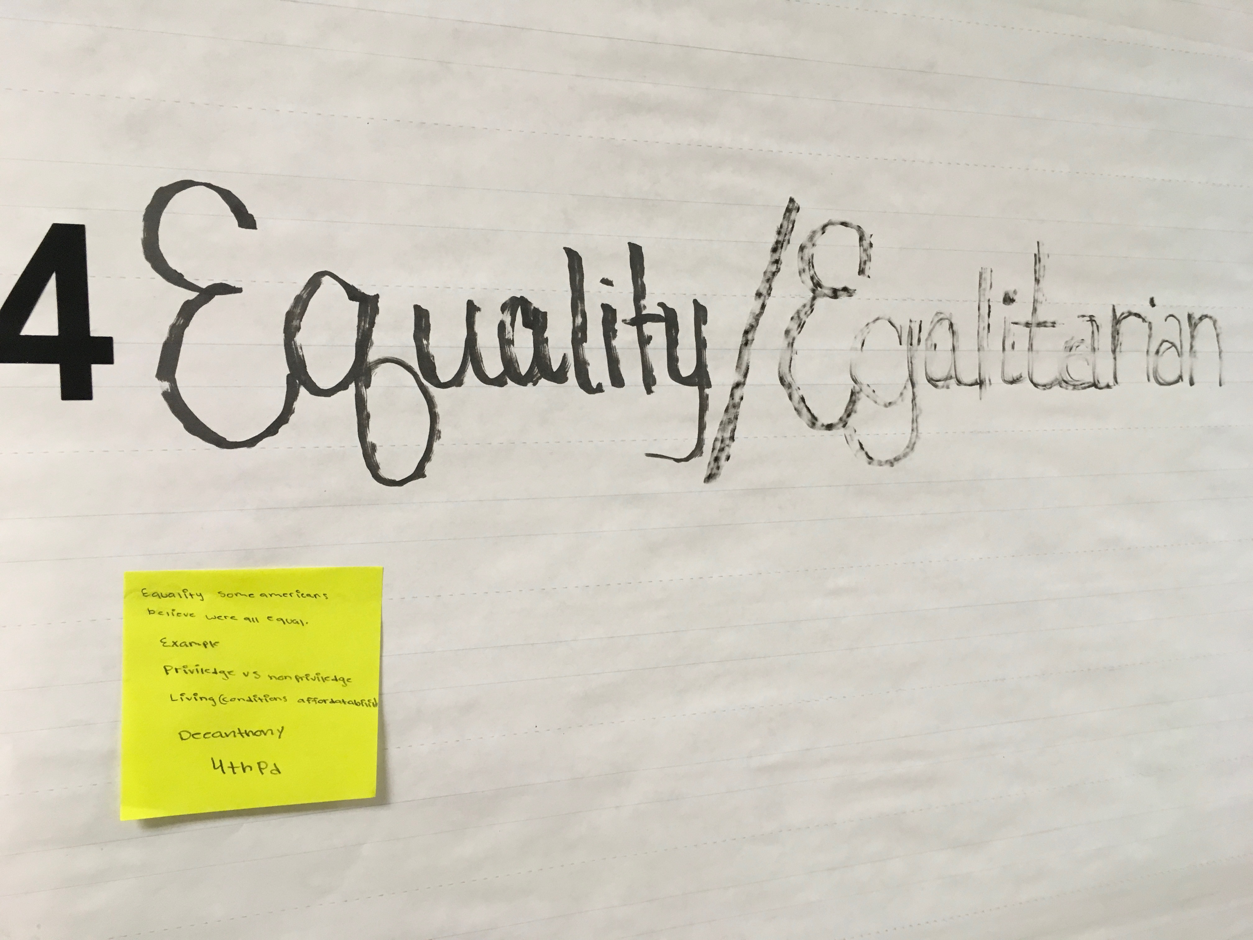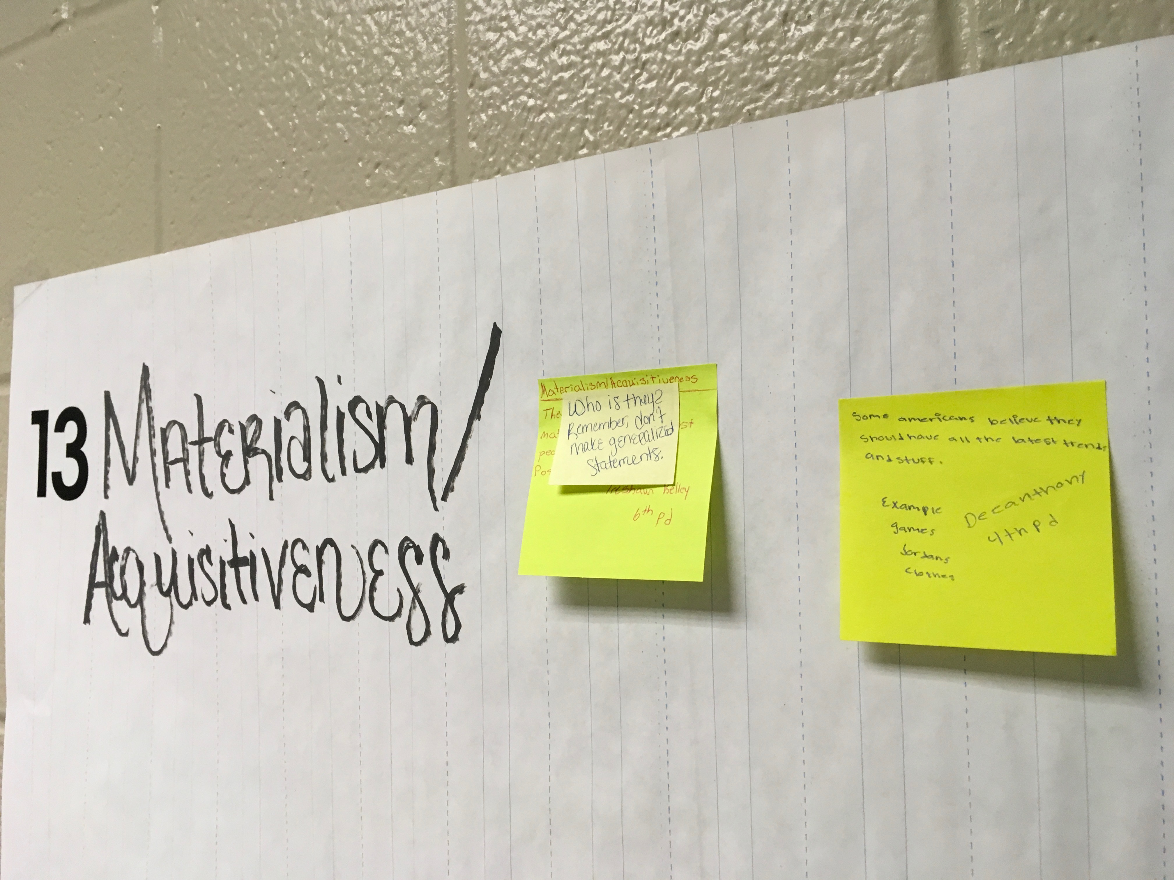 If someone else has already posted a sticky note with the example, then you CANNOT post yours. Among my 9th grade students, I have a total of 55 students, therefore Therefore, for each value, maximum, for now, only FIVE sticky notes posted to each value. You may come into class before the first period bell, during first, and second periods to post your sticky notes. However, you cannot come during 3rd-7th period because I am teaching classes during these times. Of course, you can post it at the beginning of your class period.